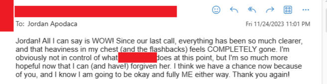 Any testimonials or success stories shared represent individual experiences only.With that said: we are committed to working with you until the specific agreed upon outcomes are achieved, at no additional cost, provided you remain coachable and committed. This commitment applies only to the specific root cause/trauma identified at the start. It does not cover new life challenges, general relationship maintenance, or issues unrelated to the original goal. (Ongoing support for these areas requires a separate "Maintenance Agreement").4. Client ResponsibilityYou are solely responsible for:Your own physical, emotional, and mental well-being before, during, and after sessions.Deciding how to apply any insights, tools, or techniques discussed.Continuing or seeking medical or therapeutic care as appropriate.Ensuring that any actions you take comply with applicable laws and regulations in your jurisdiction.To remain eligible for the Success Commitment, you agree to:Remain Coachable: You agree to follow the Practitioner's lead regarding the timing and spacing of sessions.Communication Protocol: You agree to use email ([email protected]) strictly for scheduling and administrative purposes. You acknowledge that the Practitioner does not provide feedback, coaching, or crisis support via email or text between sessions.5. ConfidentialityPrivate sessions are confidential.